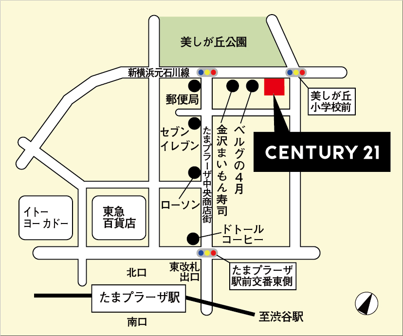 神奈川県横浜市青葉区美しが丘2丁目9番地19 東急田園都市線「たまプラーザ」駅 徒歩5分。 ①たまプラーザ駅東口(francfranc目印)を出てすぐの信号(たまプラーザ駅入口)を、「ドトールコーヒー」ががある方へ渡ります。 ②ドトールコーヒーを左手に見ながらそのまま真っ直ぐ商店街(たまプラーザ中央商店街)をそのまま直進してください。 ③つきあたりまで進むと、大きな木々がある美しが丘公園(信号があるT字路)に突き当たります(左手側に横浜美しが丘郵便局があります)。 ④信号を渡らず右折し、「まいもん寿司」や「ベルグの4月」並びにセンチュリー21アイワハウスがあります。 |